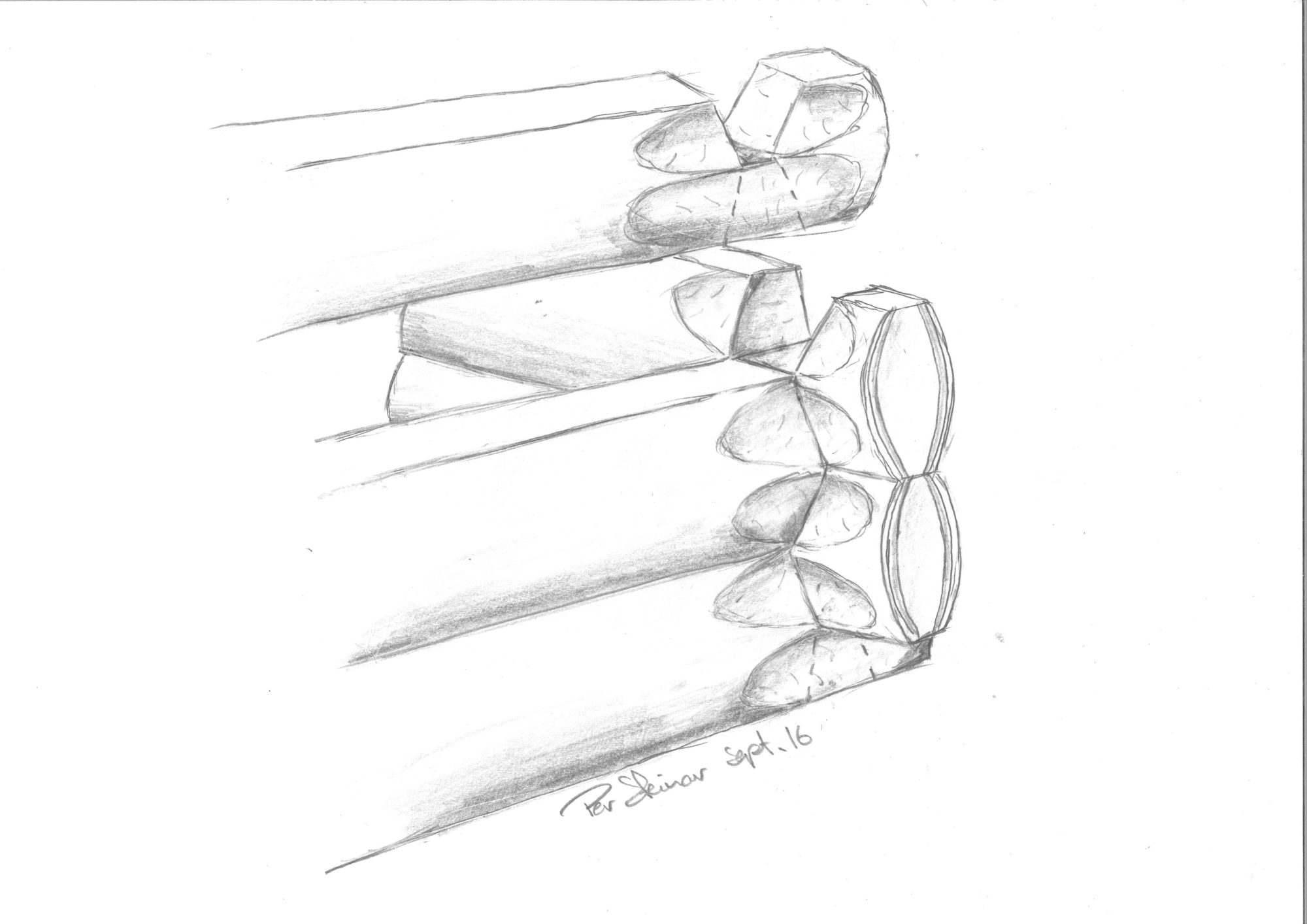 Vi har i hovedsak vært tre personer som har tømret opp loftet samt stått for innredning og skjæring av dekor: Øystein Viem – kunstner og smed, Kai Johansen – treskjærer, og undertegnede – som er arkeolog. Altså ingen tømrere! I arbeidet med å finne fram til de riktige lafteteknikkene, og å lære oss disse, fikk vi verdifull hjelp av tradisjonshandverker og universitetslektor ved NTNU, Roald Renmælmo. I samråd med ham bestemte vi oss for å bruke to ulike lafteknuter i bygget. I første etasje en enkel knute som ligner på de som tidlige er funnet under utgravinger i Trondheim. På svensk heter den rännknut, på norsk kan vi nok kalle den en enkel findalsknute. I andre etasje, når vi var litt mer vant med tømringa, gikk vi over til en mer avansert findalsknute med skjulte kinninger. Vi valgte å tømre med en ovalformet stokk, blant annet med bakgrunn i de dimensjonene vi hadde tilgjengelig på tømmeret.